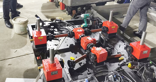 多臺聯(lián)動絲桿升降機(jī)平臺,電機(jī)在中間,電機(jī)連接轉(zhuǎn)向箱或者K系列減速機(jī),在通過連接桿和···